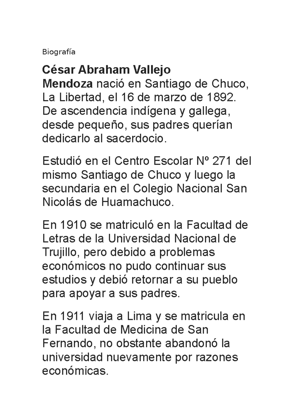 Biografía resumida del escritor Cesar Vallejo Biografía César Abraham Vallejo Mendoza nació en