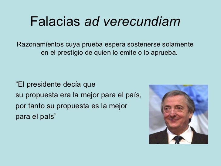 Características del argumento ad verecundiam o falacia de autoridad. La característica principal de la falacia de autoridad es que busca dar validez a una afirmación apoyándose en lo dicho por expertos. No obstante, la apelación a la autoridad puede contener errores, de los que se desprenden conclusiones equivocadas.. Ejemplos de.