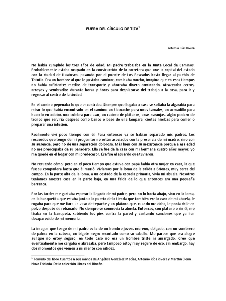 PREVIEW PDF. Fuera del círculo de tiza 1 Artemio Ríos Rivera. No había cumplido los tres años de edad. Mi padre trabajaba en la Junta Local de Caminos. Probablemente estaba ocupado en la construcción de la carretera que une la capital del estado con la ciudad de Huatusco, pasando por el puente de Los Pescados hasta llegar al pueblo de Totutla.