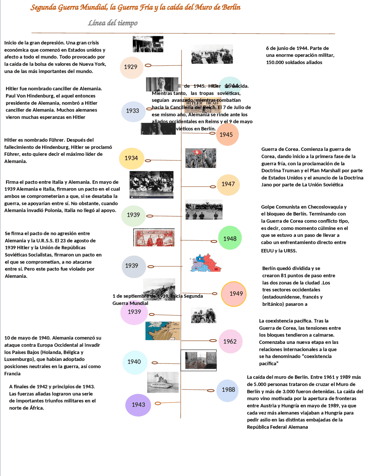 Vista previa parcial del texto. ¡Descarga linea del tiempo segunda guerra mundial y más Esquemas y mapas conceptuales en PDF de Historia solo en Docsity! Segunda Guerra Mundial, la Guerra Fría y la caída del Muro de Berlín Línea del tiempo Inicio de la gran depresión. Una gran crisis económica que comenzó en Estados unidos y afecto a.