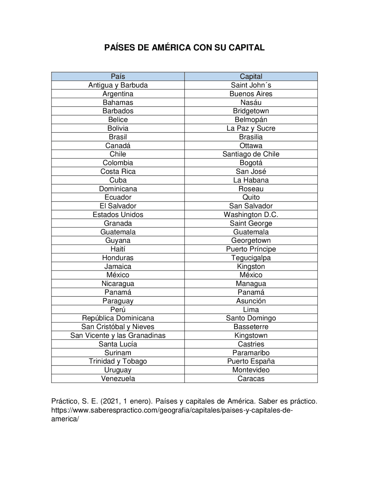A continuación te mostramos una lista de los 35 países de América con sus respectivas capitales. PAÍS. CAPITAL. Antigua y Barbuda. Saint John. Argentina. Buenos Aires. Bahamas. Nassau.