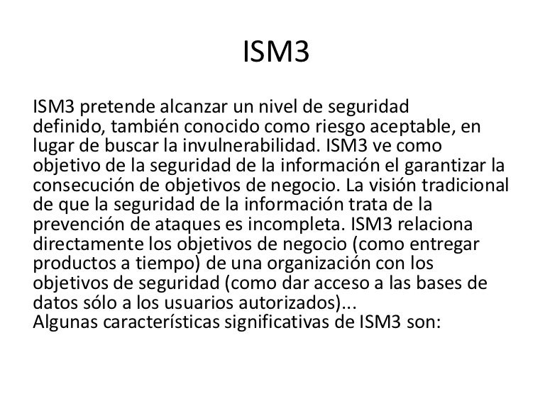 0. El Modelo de Seguridad Informática de Alto Nivel (ISM3) es un marco de referencia para la gestión de la seguridad de la información. Está diseñado para ayudar a las organizaciones a identificar, gestionar y mitigar sus riesgos de seguridad informática. Está compuesto por las mejores prácticas de seguridad informática, incluyendo los.