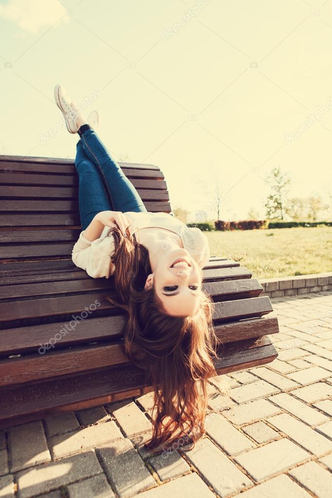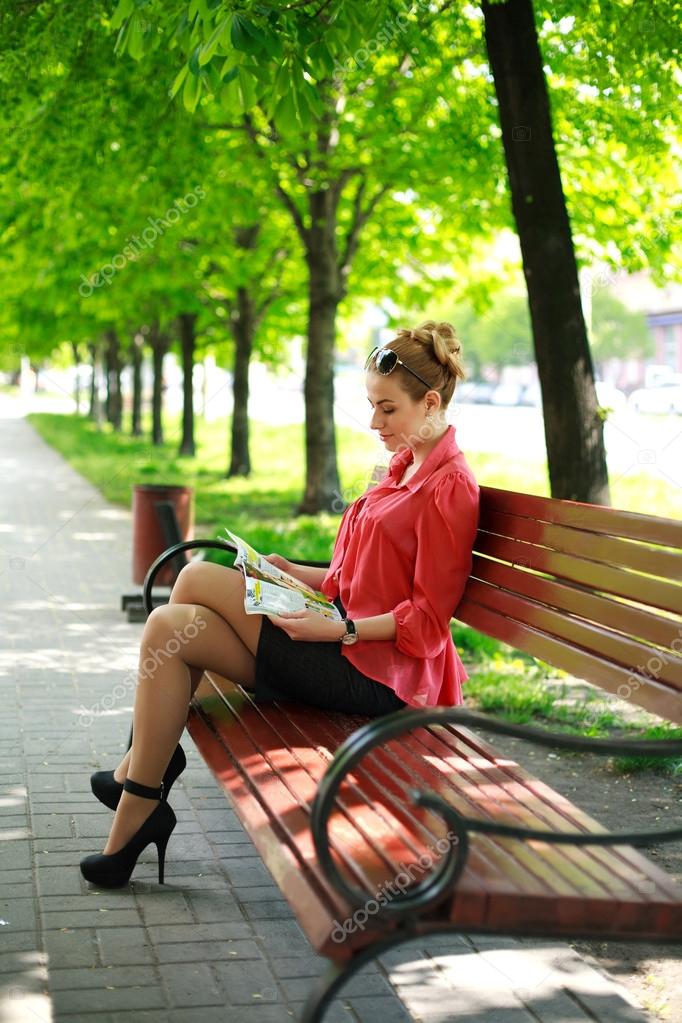 Hermosa chica sentada en un banco fotografía de stock © johanjk 48414829 Depositphotos