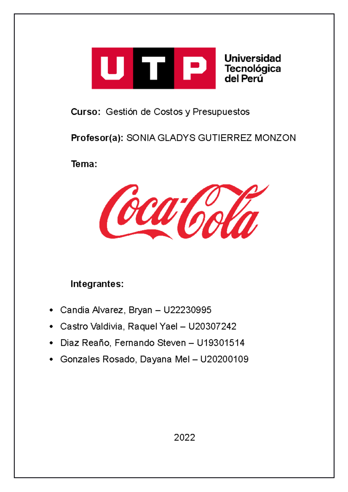 PC1 Coca Cola Costos y presupuestos Curso Gestión de Costos y Presupuestos Profesor(a) SONIA