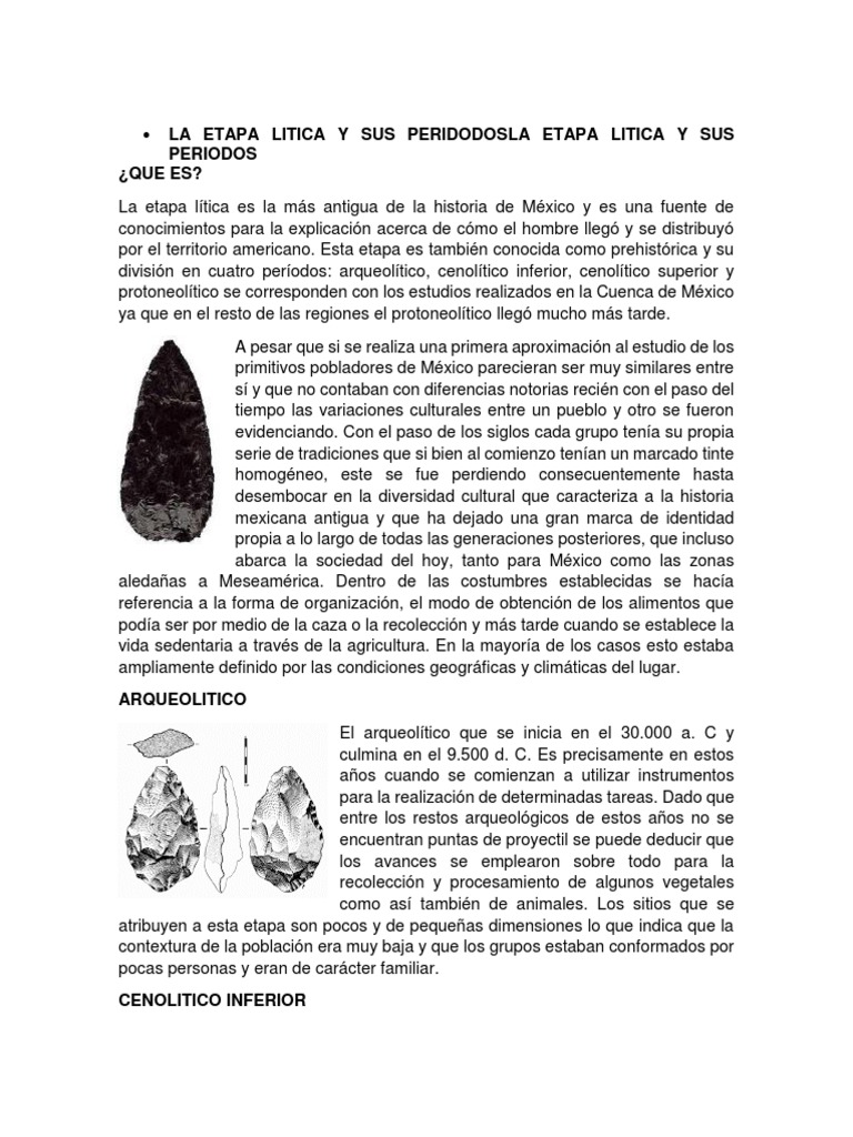 La etapa lítica es la más antigua de la historia de México y es una fuente de conocimientos para la explicación acerca de cómo el hombre llegó y se distribuyó por el territorio americano. Se han establecido periodos que subdividen dicha etapa; estos son: - Arqueolítico (30000 a 9500 a. C). - Cenolítico (9500 a 2500 a. C).